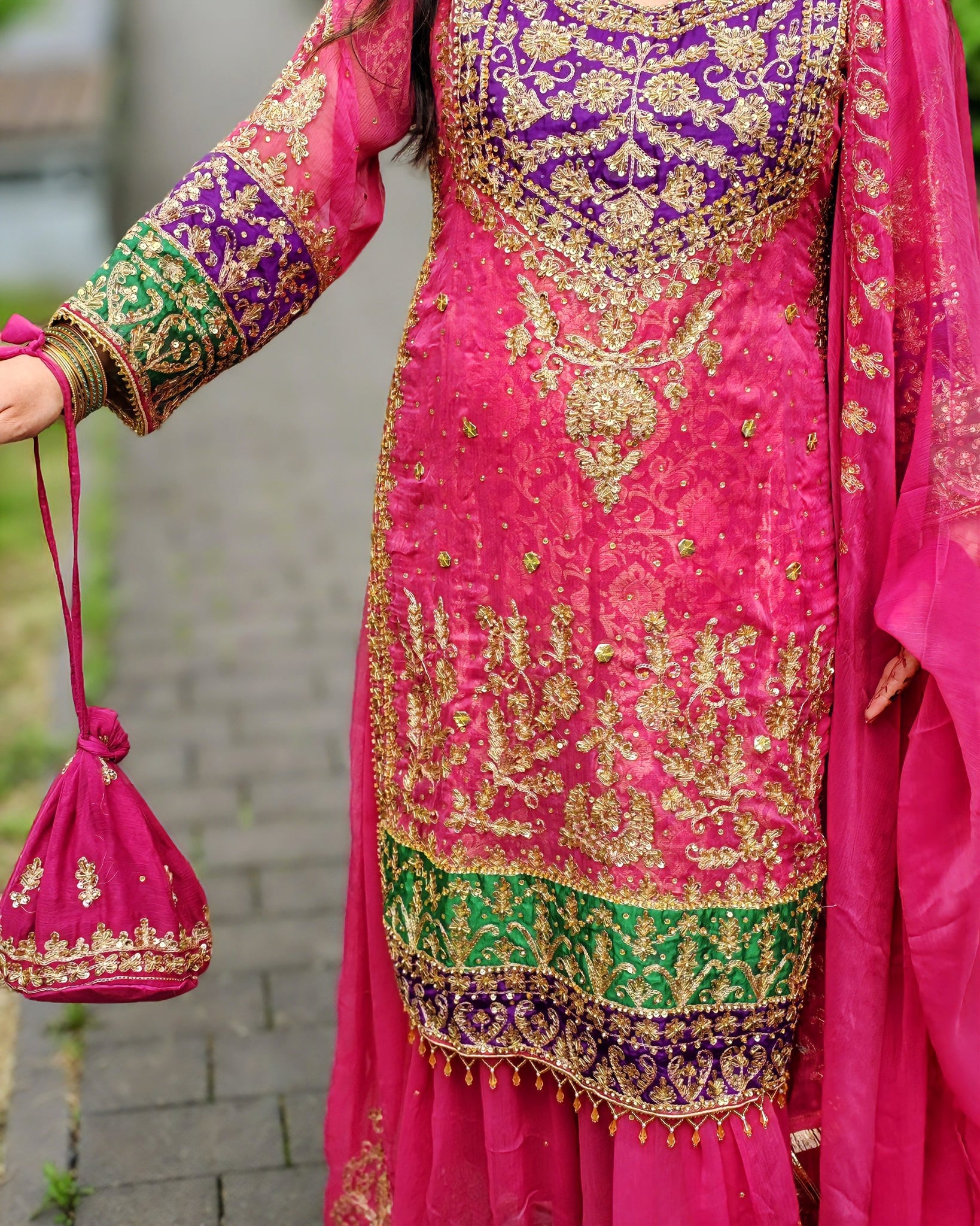 Unleash your inner royalty with Rang-e-Noor, a richly detailed 3-piece outfit that channels traditional splendor with a refined color palette. The soft pink chiffon fabric is adorned with glowing gold embroidery and fiery purple-green accents, making it a true celebration of cultural grace. From the luxuriously detailed bodice to the flowing sharara-style bottoms and matching dupatta, every element speaks of grace and cultural pride.